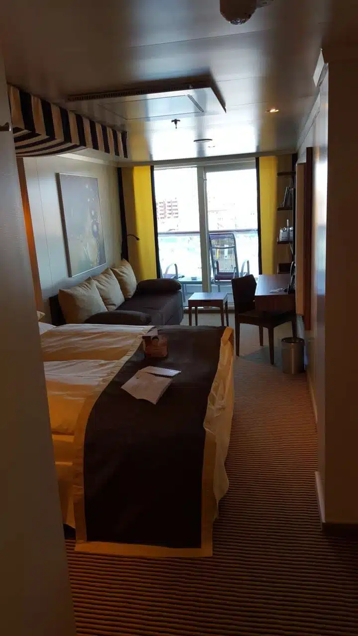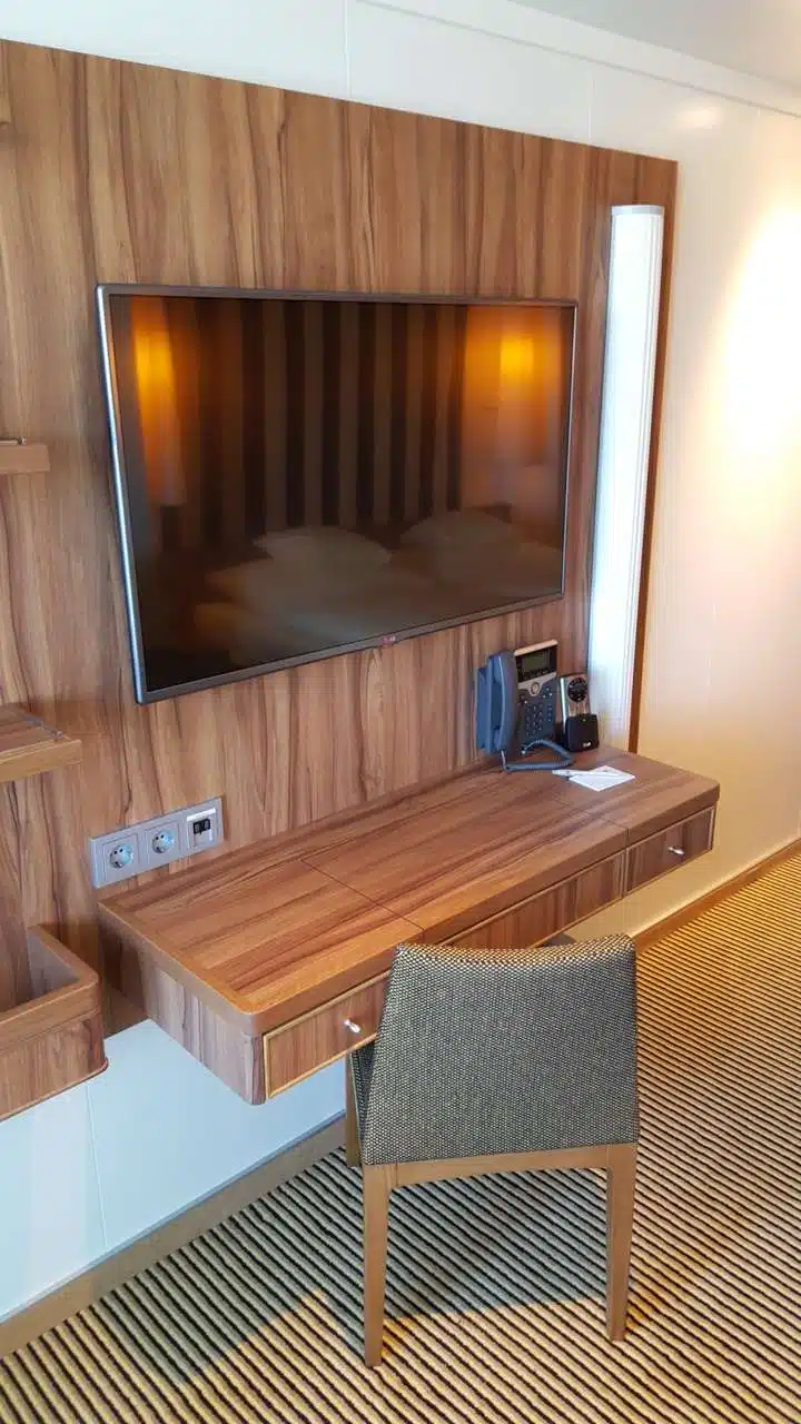 Die Kabine hat einen Balkon, ein geräumiges Bad, einen riesigen Fernseher und einen praktischen Schreibtisch, aus dem sich für die Damen ein Spiegel ausklappen lässt.