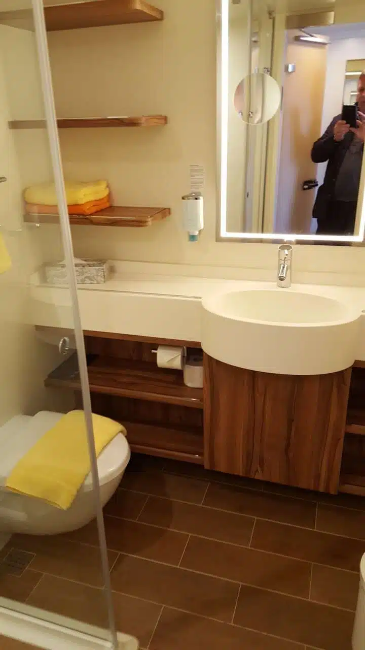 Natürlich gibt es auch einen Fön und ein Safe.Alles in allem kann man sich in einer solchen Kabine sehr wohl fühlen. Die AIDAprima wird heute gegen 20 Uhr Hamburg verlassen und mit einer Lichtershow an den Landungsbrücken vorbei fahren.