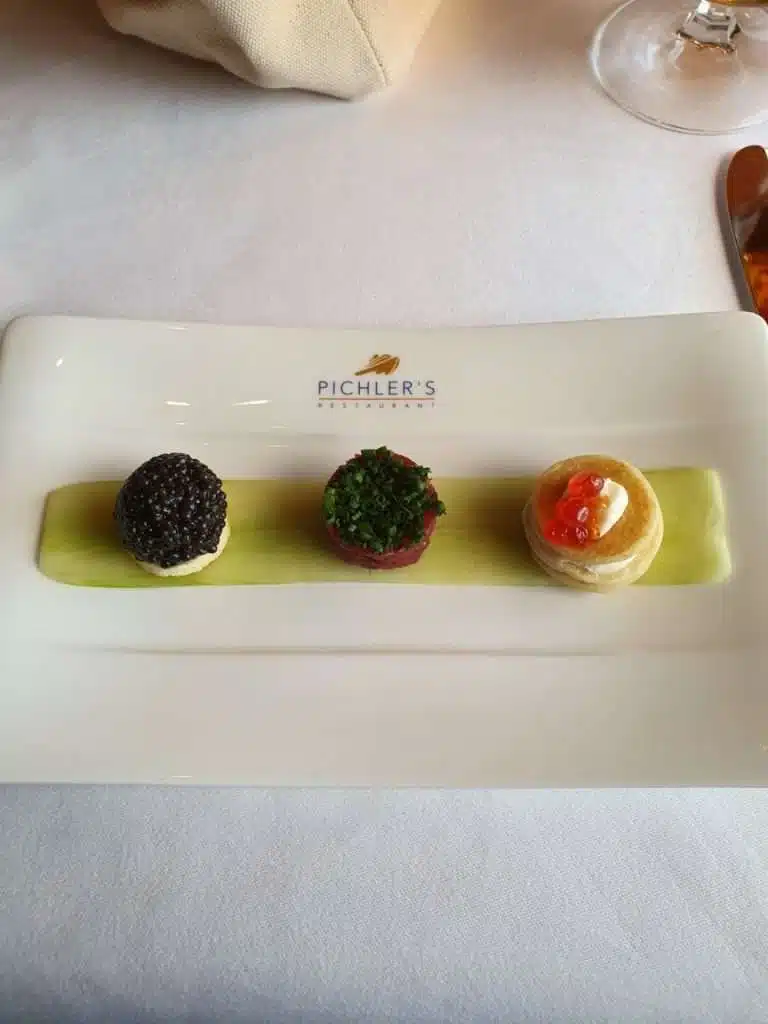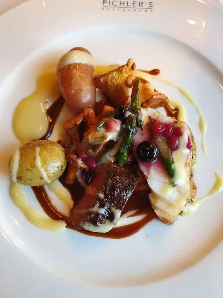 MS Amera Reisebericht — Da sind wir schon beim Essen angekommen. Der Höhepunkt an Bord der MS Amera ist das Pichlers Restaurant. Das Essen an Bord ist durchgängig sehr gut aber das Pichlers setzt dem ganzen die Krone oben auf! Haben Sie schon einmal Rentier und Seeteufel auf einem Teller gehabt? Sie sollten es unbedingt probieren! Dazu gibt es abgestimmte Weine und zum Abschluss eine erstklassige Beerenauslese! Die ganze Menüfolge habe ich Ihnen fotografiert.