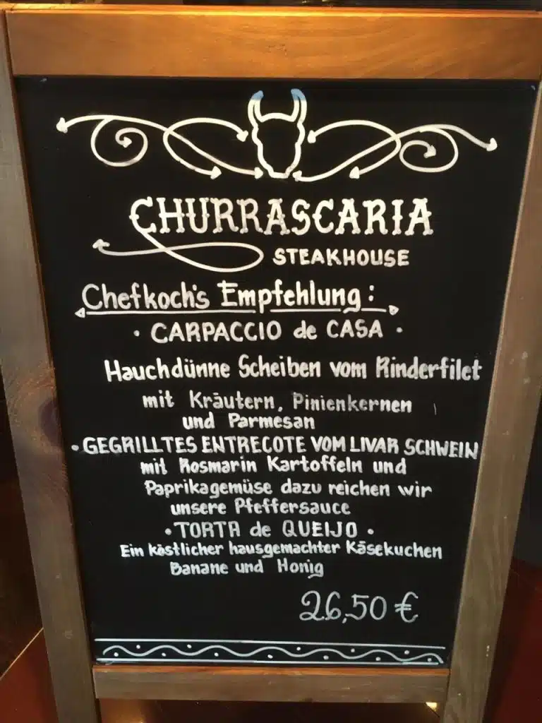 Preis: Rodizio-Menü 28,50 EUR, 3-Gang-Menü 26,50 EUR, Steaks zwischen 17,50 EUR (250g Rib-Eye-Steak) und 38,90 EUR (240g Bison-Tenderloin)