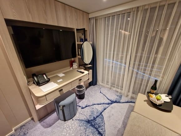 Ausstattung: Telefon, Föhn, spezielle Spiegel, TV, Safe, verschiedene Bügel, Es gibt bereits USB-Anschlüsse, aber aus meiner Sicht eher schlecht verteilte Steckdosen. (Es gibt aber genug) Am Schreibtisch selbst gibt es nur eine, aber das ist natürlich meckern auf hohem Niveau, weil ich zu viele Geräte habe.