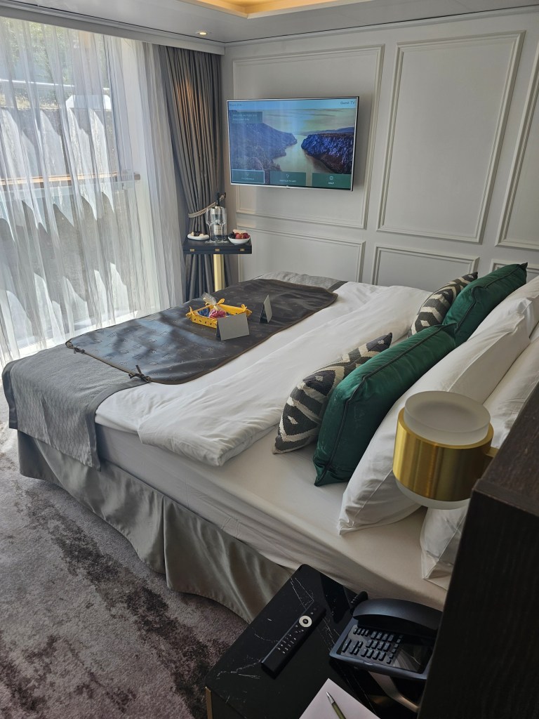 Ich war besonders beeindruckt von meiner Kabine, hier auch „Suite“ genannt. Diese ist deutlich geräumiger als ich es von anderen Flussschiffen gewohnt bin Die Highlights: ein begehbarer Kleiderschrank, eine luxuriöse Regendusche, doppelte Waschbecken und hochwertige Kosmetikprodukte. Etwas, das sofort ins Auge fiel, war die einzigartige Positionierung des Bettes mit einem besonderen Blick direkt aus dem Fenster.